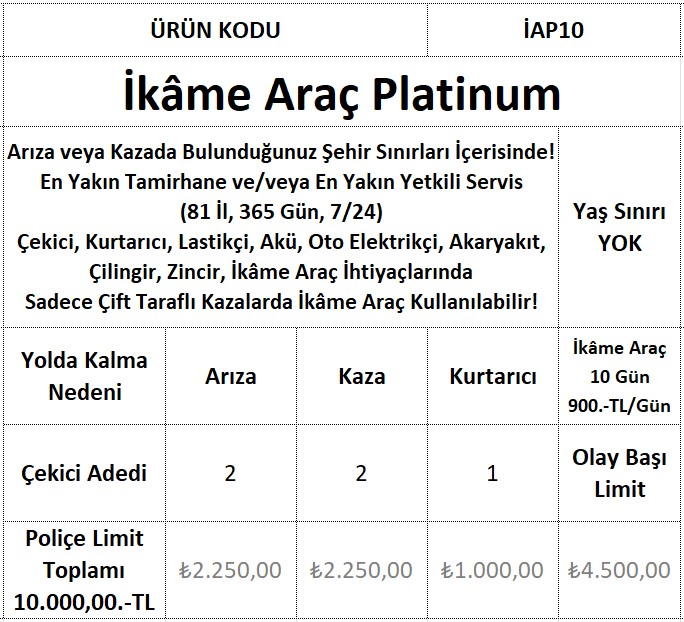 Yılda 2(iki) kez arıza, yılda 2(iki) kez kaza1 Adet Kurtarma Hizmeti başına 4500(dörtbinbeşyüz) TL’ye kadar toplamda 10000(onbin) TL teminat sunulur.