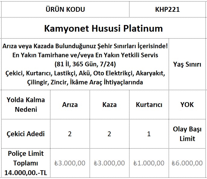 Bu ürün, hususi şahsi kişilere ait kamyonet taşıtlar için yol yardım hizmeti içerir.