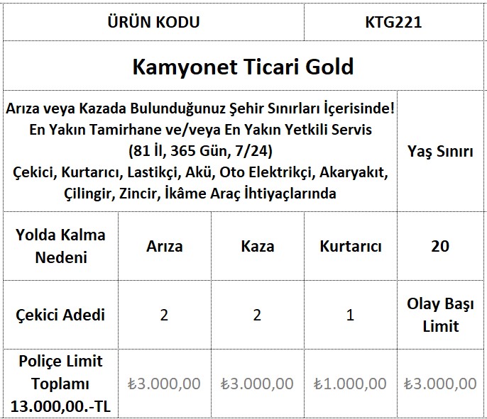 Yılda 2(iki) kez arıza, yılda 2(iki) kez kaza başına 3000(üçbin) TL(Olay başı da kullanılabilir)’ye kadar toplamda 12000(onikibin) TL teminat sunulur.
