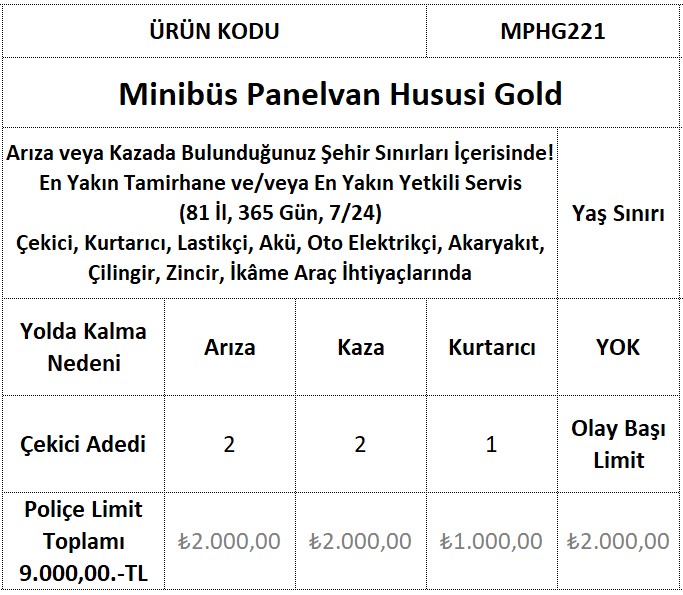 Bu ürün, hususi şahsi kişilere ait minibüs ve panelvan taşıtlar için yol yardım hizmeti içerir.