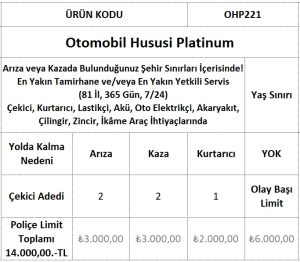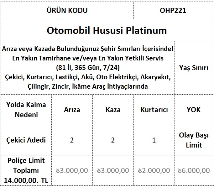Yılda 2(iki) kez arıza, yılda 2(iki) kez kaza başına 6000(altıbin) TL(Olay başı da kullanılabilir)1 Adet Kurtarma 2000(ikibin)’ye kadar toplamda 14000(ondörtbin) TL teminat sunulur.